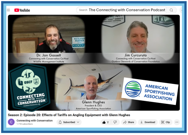 As tariffs dominate national headlines, hosts of The Connecting with Conservation (CWC) Podcast, Jon Gassett of Wildlife Management Institute and Jim Curcuruto of Outdoor Stewards of Conservation Foundation, welcome guest Glenn Hughes, president of the American Sportfishing Association (ASA), to discuss how tariffs may negatively affect the business of fishing, conservation funding and America’s 57 million recreational anglers.