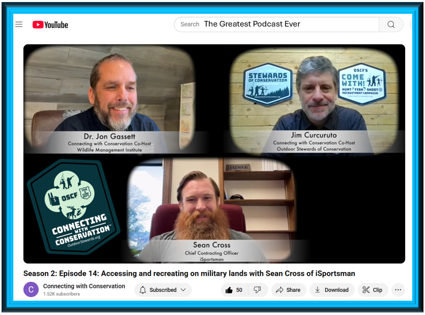 overall participation in activities like hunting. The hosts of The Connecting with Conservation (CWC) Podcast, Jon Gassett of Wildlife Management Institute and Jim Curcuruto of Outdoor Stewards of Conservation Foundation, welcome Sean Cross, chief contracting officer at iSportsman, to discuss how to legally access millions of acres of Department of Defense lands for hunting, fishing, target shooting and even collecting pine needles.