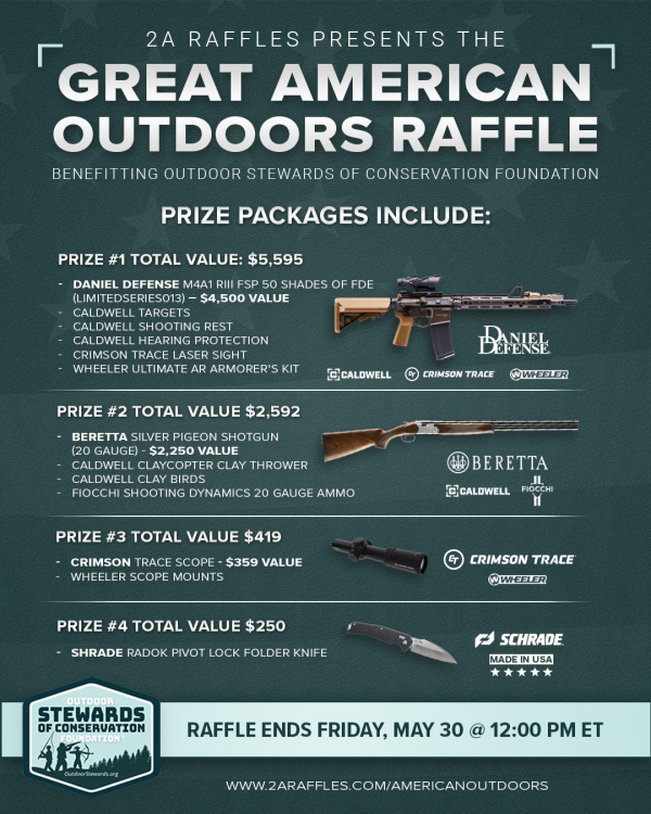 The Great American Outdoors Raffle ends on May 30, 2025. Click here to enter for the chance to win one of four prize packages and support the Outdoor Stewards of Conservation Foundation.