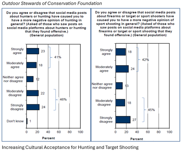 The Outdoor Stewards of Conservation Foundation was among the first to identify the drop in cultural acceptance of hunting and recreational shooting, and then to quantify the magnitude of the decline. In 2023, OSCF released “Americans’ Attitudes Toward Legal Regulated Fishing, Target Shooting, Hunting, and Trapping” report. That effort measured a loss of approval of hunting by some 9.9 million voting-aged Americans and loss in approval of target shooting by 8.9 million folks, and, as noted earlier, the loss in cultural acceptance continues to rise.